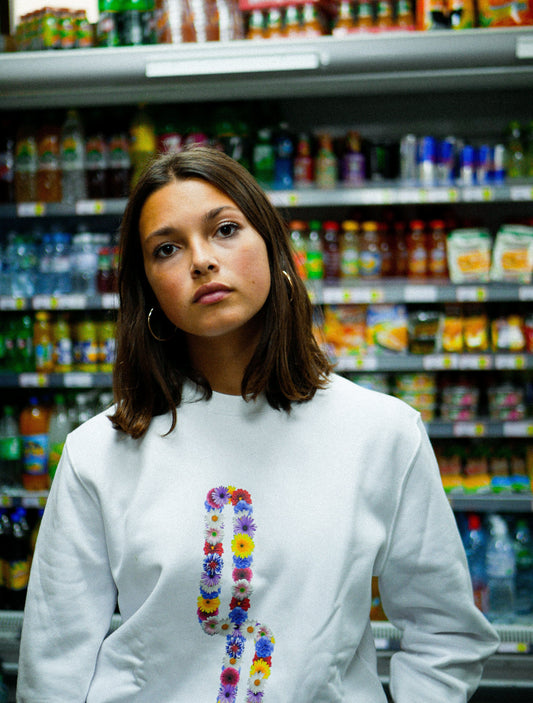 「Fiore」ラウンドネックスウェットシャツ、ホワイト。